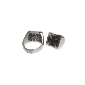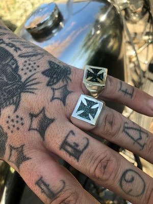 The Iron Cross Inlay Ring is made from bright 925 sterling silver hand carved and cast using lost wax techniques. Stone chips are set in clear resin. This unisex Ring is large and chunky to suit the hand. It has a thick band and will last on busy hands.